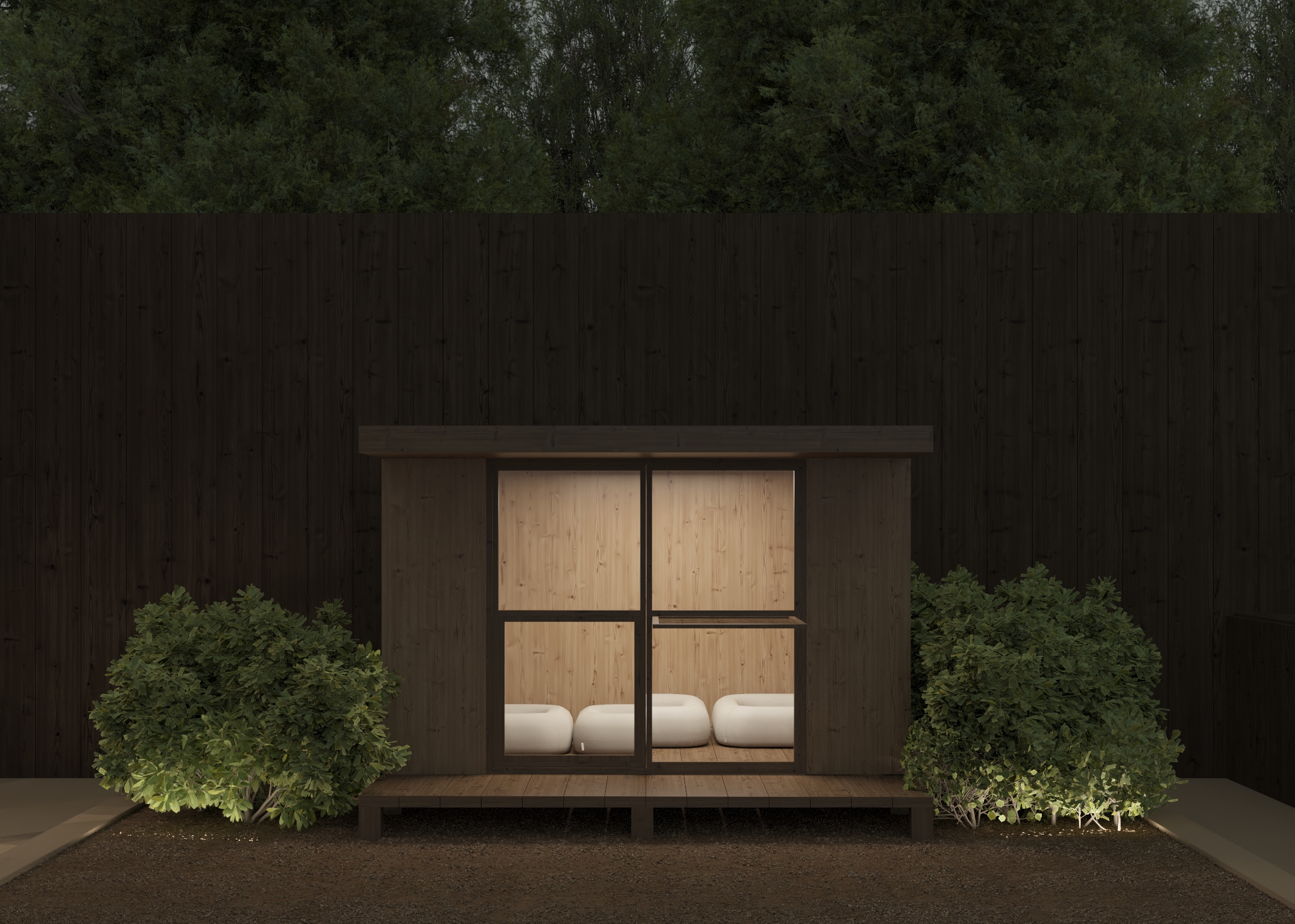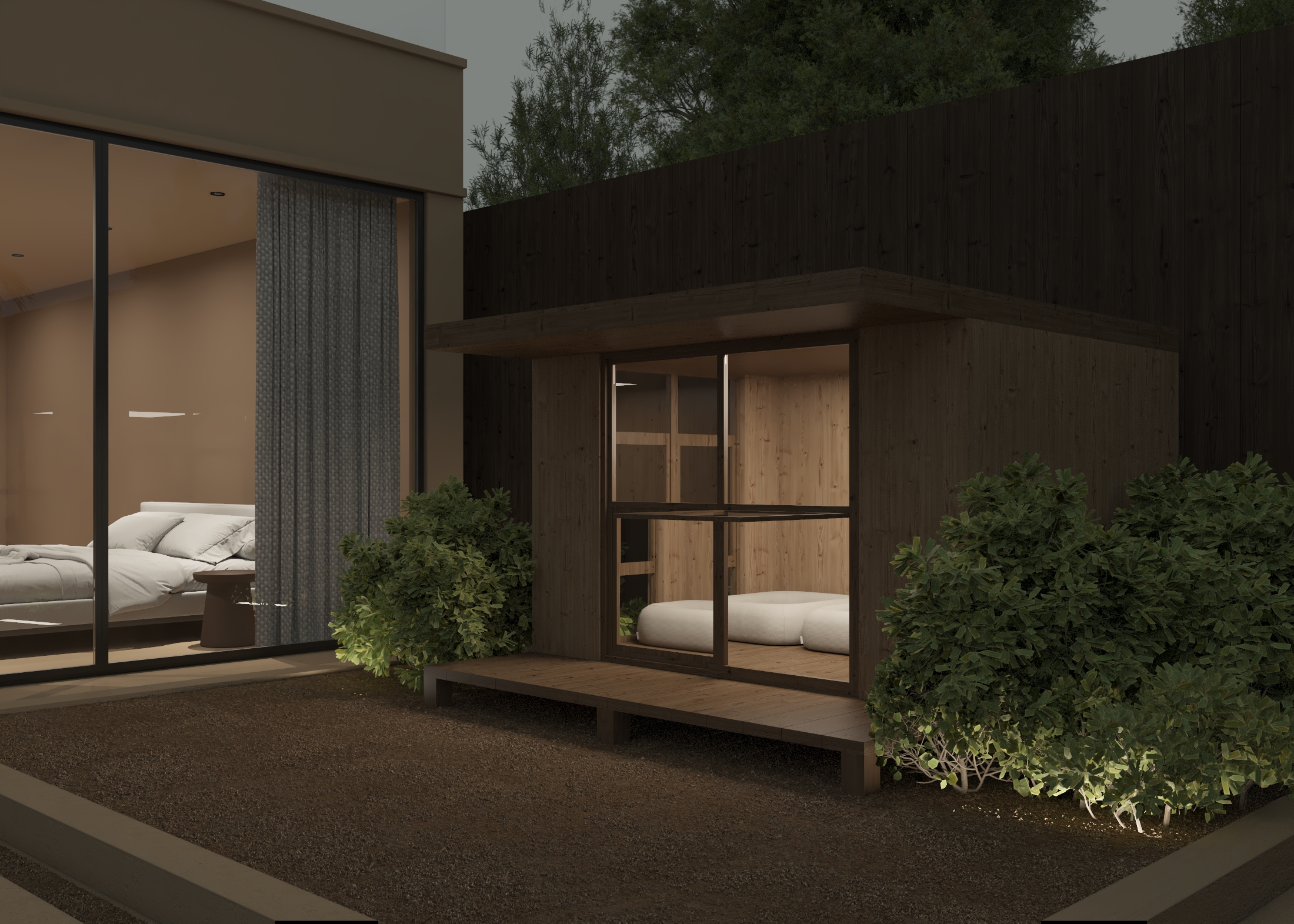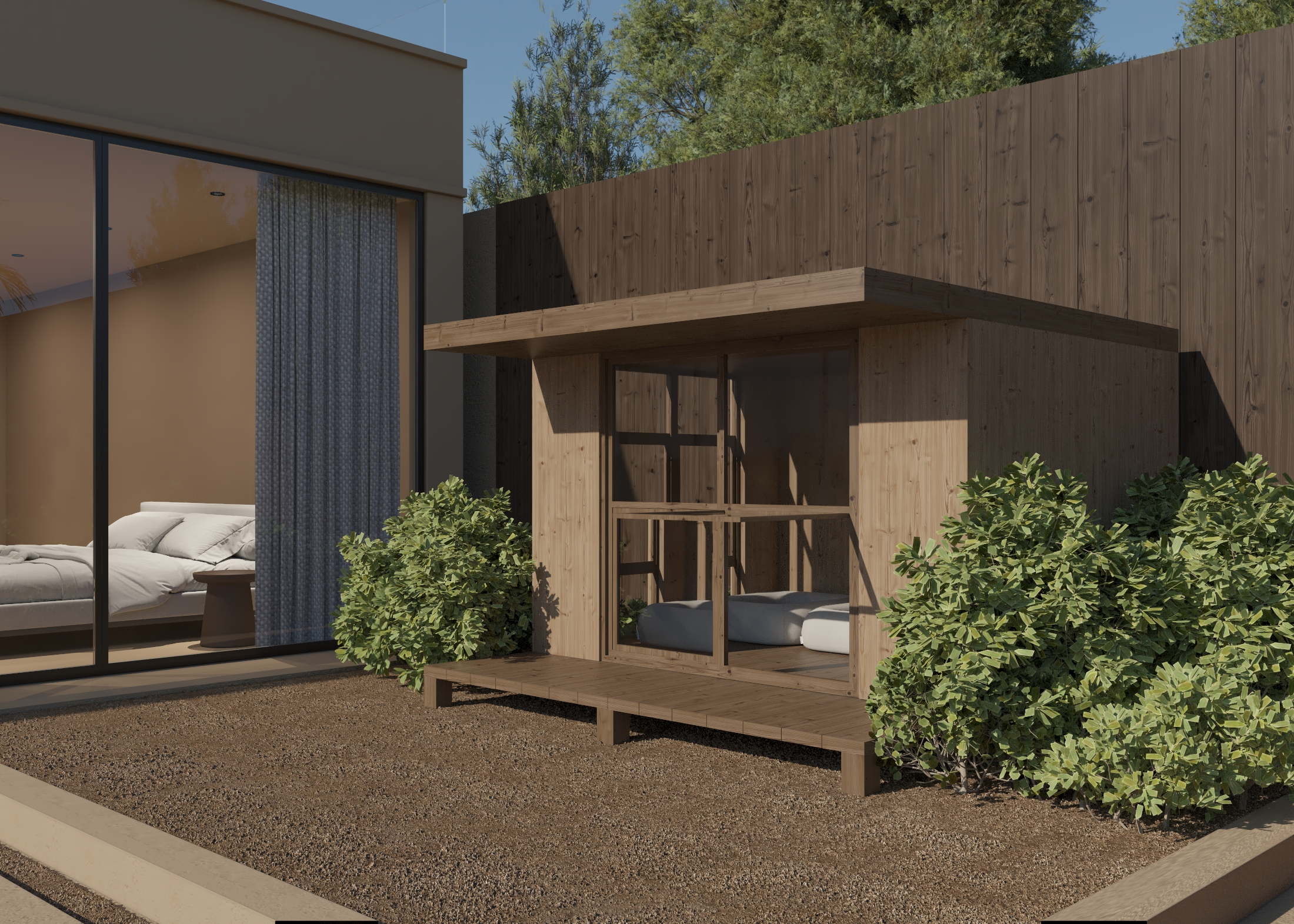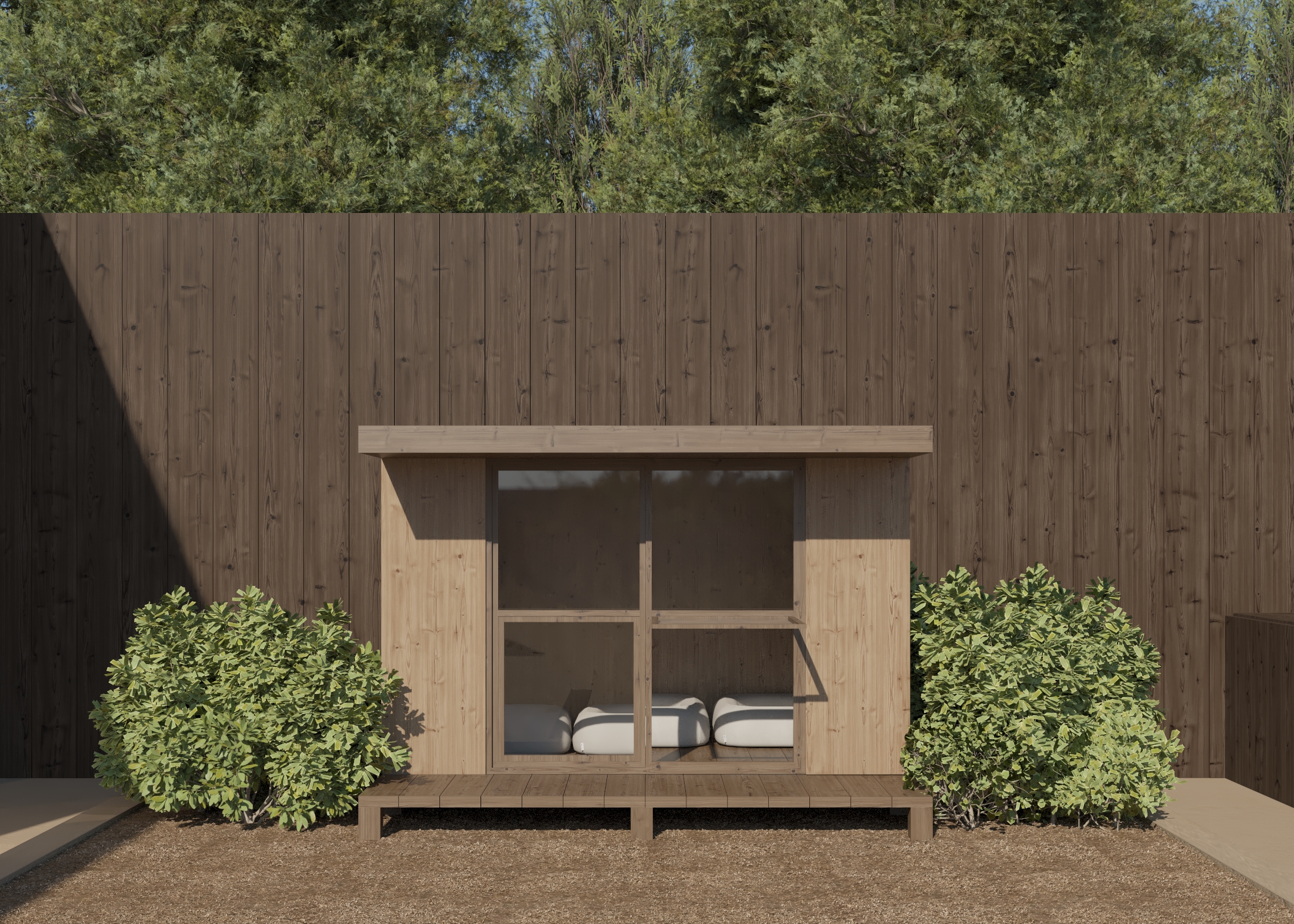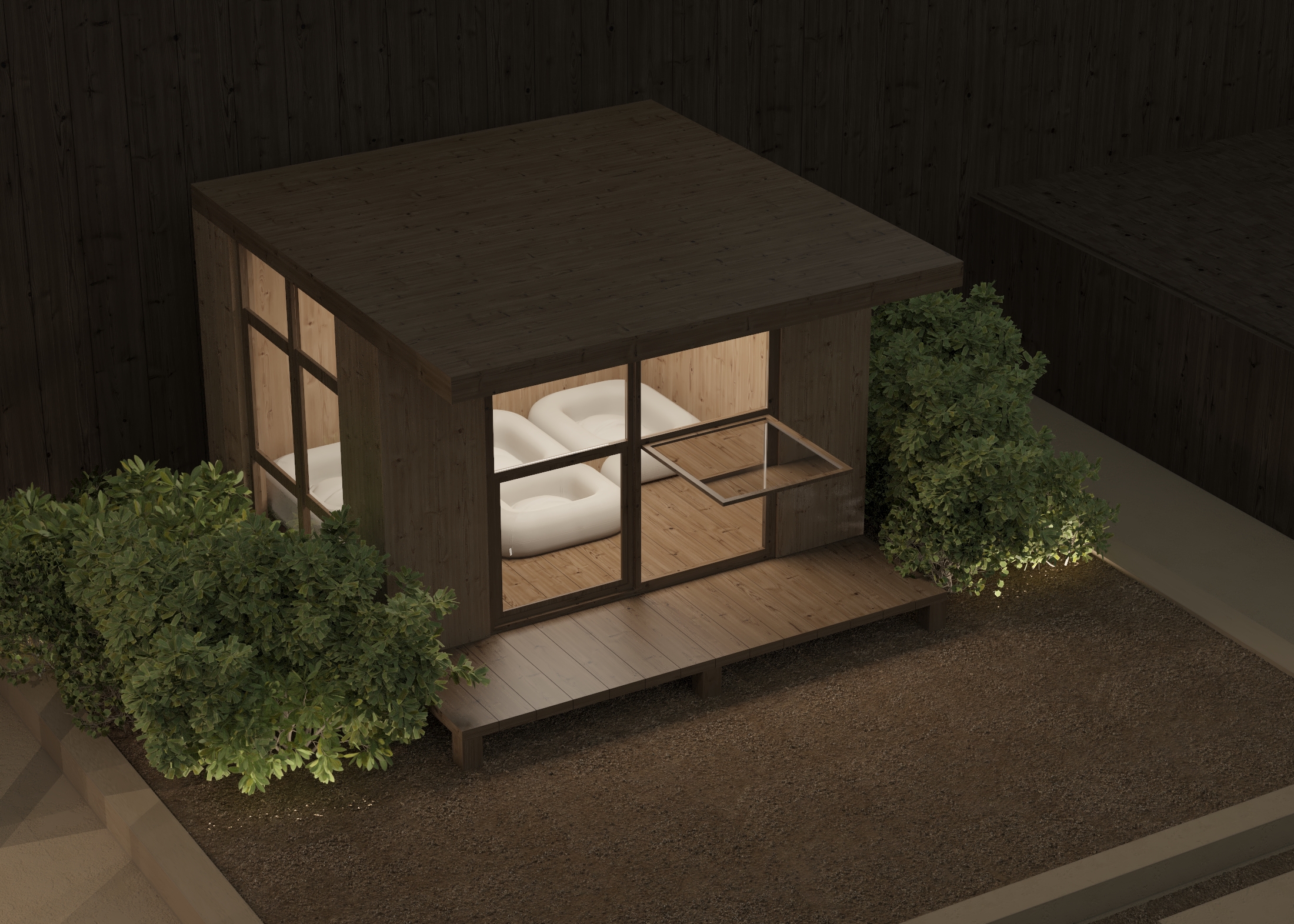 Dual Pitch Pod by the water with outdoor lounge
